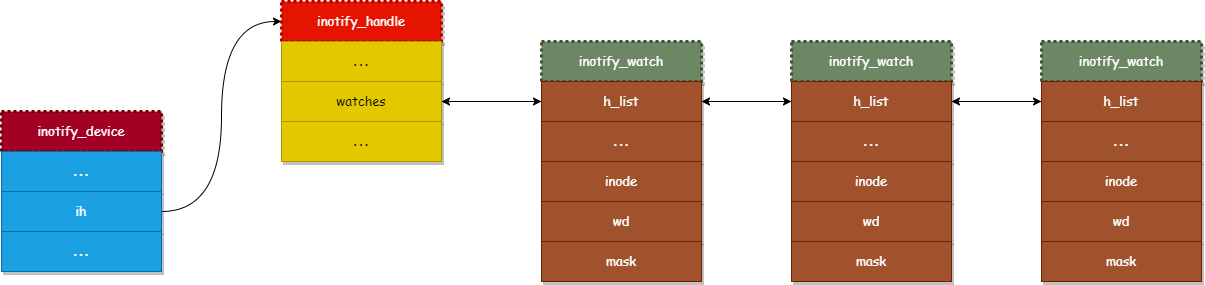 现在,我们通过下图来描述一下 inotify_device、inotify_handle 和 inotify_watch 三者的关系: