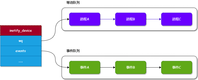下图描述了 inotify_device 对象中两个比较重要的队列(等待队列 和 事件队列):